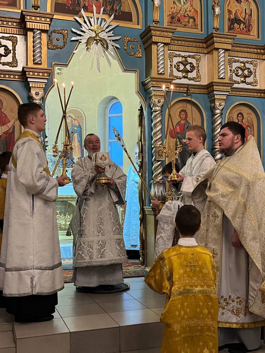 Его Преосвященству сослужили: секретарь Каинской епархии иерей Павел Говоров; диакон Георгий Бекарев.