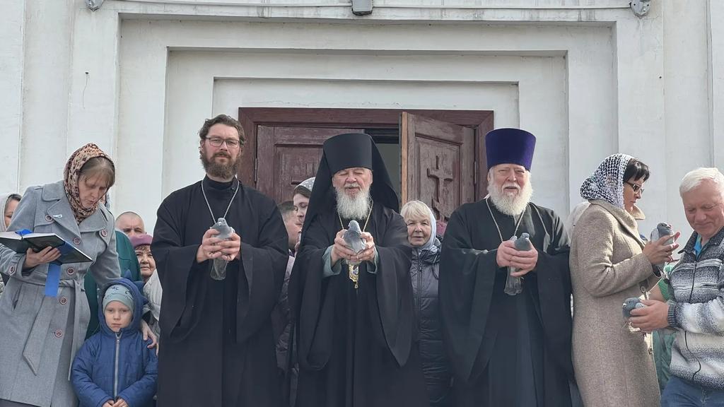 По окончании богослужения по традиции владыка совместно с священнослужителями и прихожанами выпустили в небо голубей.